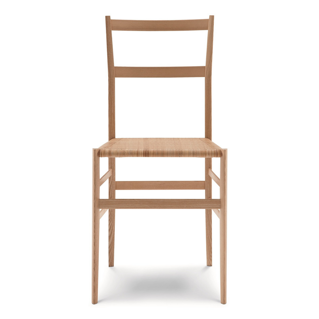 Der Stuhl „Superleggera“ ist in den folgenden Ausführungen erhältlich: Gestell in Esche natur oder weiß bzw. schwarz lackiert mit einer Sitzfläche aus