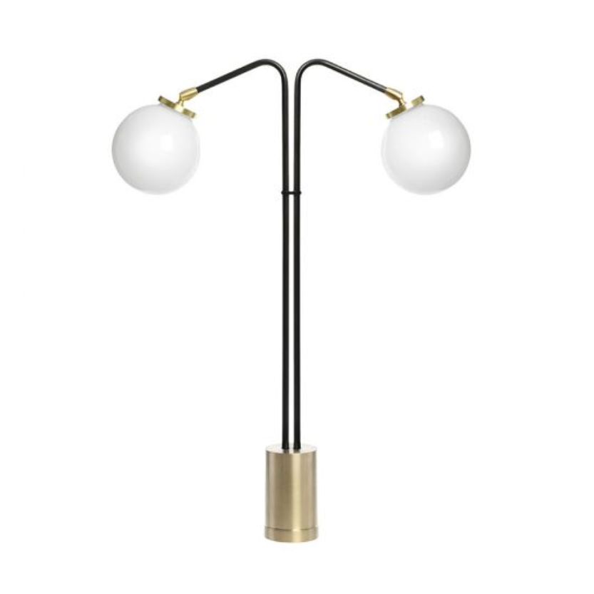 Dieses elegante Design besitzt eine klassische Ausstrahlung. Die geschwungenen Hälse der doppelten Arme schaffen eine harmonische Balance, die dem Objekt eine besondere ästhetische Wirkung verleiht. Der Kontrast zwischen Bronze- und satiniertem Messingfuß und den schwarz lackierten Stielen verstärkt den visuellen Reiz der schlichten Konstruktion aus Kugel und Stiel, die durch die kugelförmigen Opalglasschirme elegant ergänzt wird.