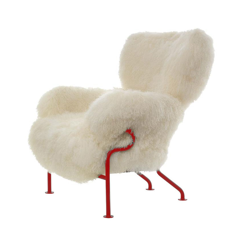 Das Ergebnis ist ein brandaktueller Sessel mit Bühnenpräsenz, der von Cassina unter getreuer Beachtung des ursprünglichen Entwurfs in dieser limitierten Auflage herausgegeben wurde. Sichern Sie sich einen der letzten Sessel mit weißem Mongolia-Fell und rotem Gestell.