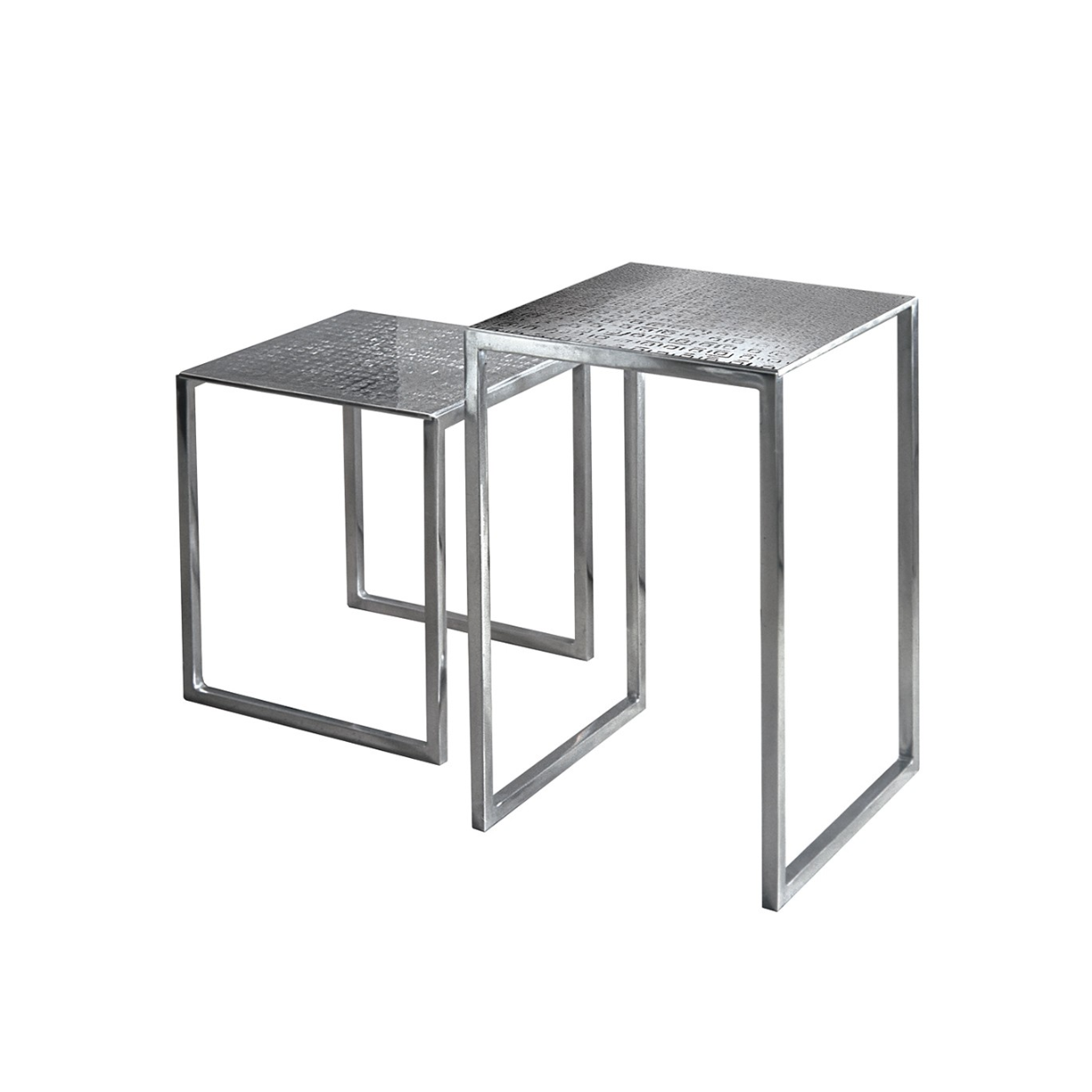 CND 60 ist ein Beistelltisch mit einer strukturierten Oberfläche. Er wird aus gegossenem Aluminium gefertigt, das im Sandgussverfahren hergestellt wird. Die Oberfläche ist aus gebürstetem Natur-Aluminium, was dem Tisch einen rohen, authentischen Charakter verleiht.