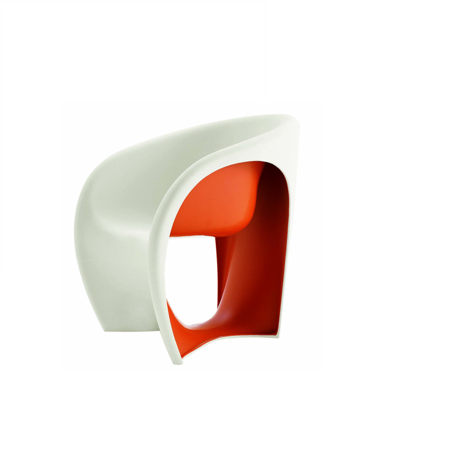 Der MT1 Lounge Chair von Ron Arad für Driade ist ein ikonisches Sitzmöbel mit spielerischer und skulpturaler Formensprache, gefertigt aus einem einzigen Stück rotationsgeformtem Polyethylen. Die Außenseite ist in Sandweiß, die Innenseite wahlweise in Rot oder Schwarz gehalten – eine kontrastreiche Gestaltung, die die organische Linie des Stuhls besonders betont.