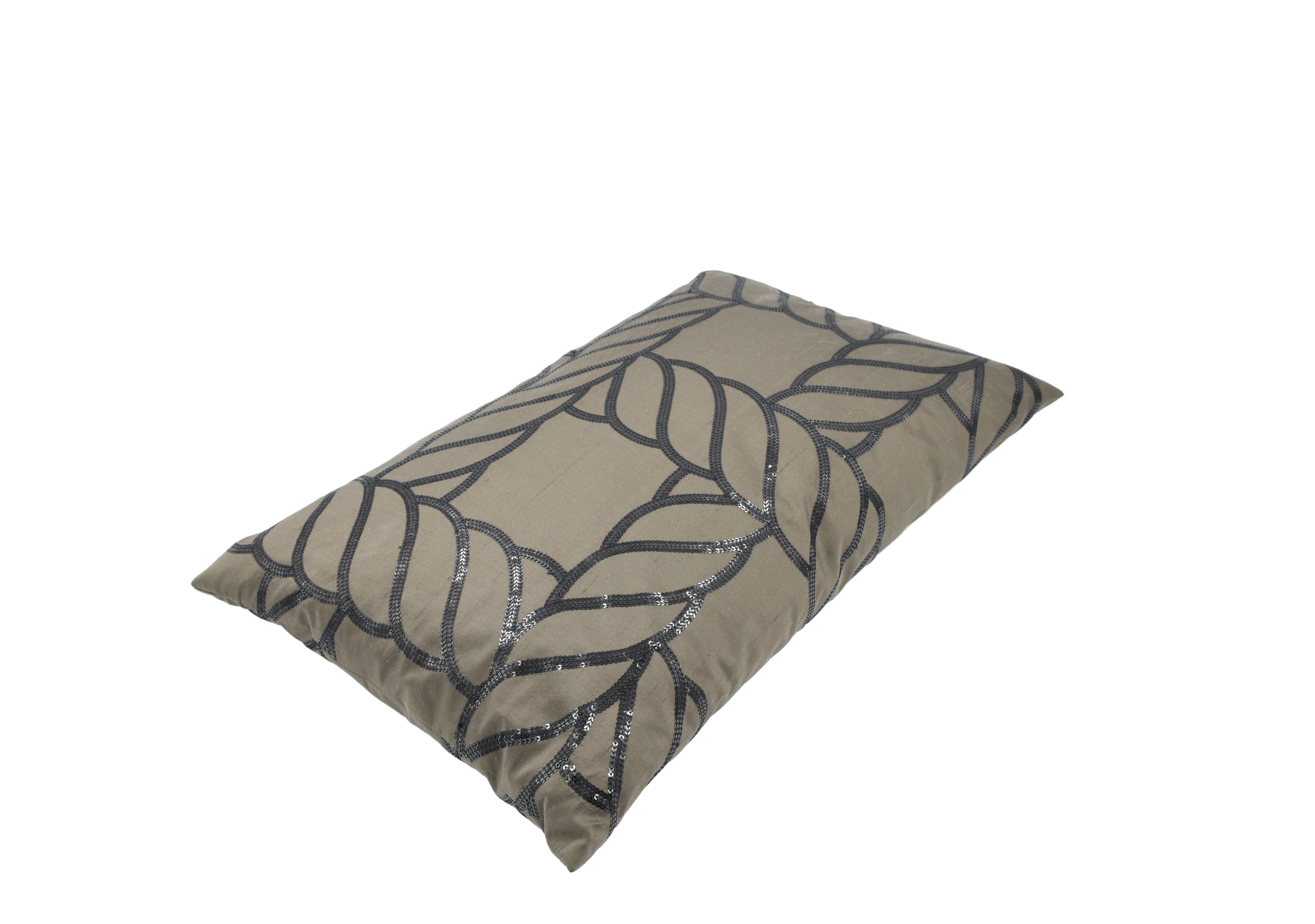 Avantgardistisches Zierkissen mit einem stilisierten, übergroßen Kordelmotiv, das mit feinen Pailletten bestickt ist. Der edle Fond aus Dupionseide sorgt für einen eleganten Kontrast. Der Stoff wird bewusst auf links verarbeitet, sodass die Oberkante nahtfrei bleibt – ein raffiniertes Detail, das das moderne Design unterstreicht.