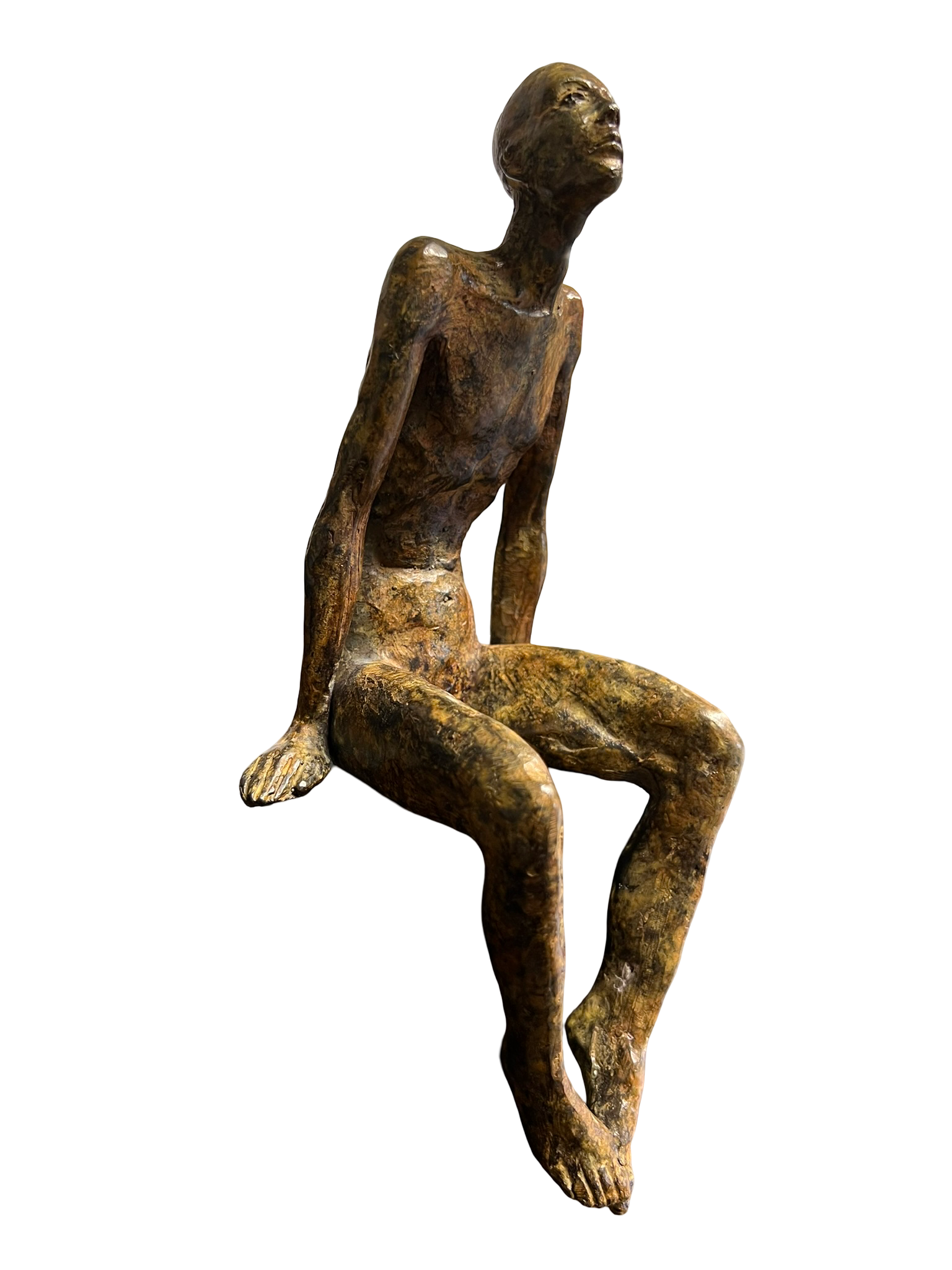 Eine Skulptur, die Stärke und Zerbrechlichkeit vereint, dargestellt in einer sitzenden menschlichen Figur mit dem Blick nach oben. Der verlängerte Körper, die reduzierten Formen und die unregelmäßigen Oberflächen betonen die handwerkliche Arbeit und den Ausdruck der Bronze, die mit ihren warmen, brünierten Nuancen Tiefe und Lebendigkeit verleiht.