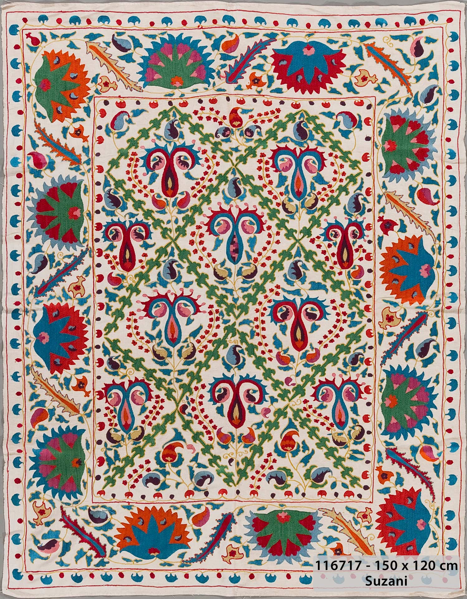 Typischerweise bestehen Suzanis aus einer Baumwoll- oder Seidenbasis, die mit üppigen Seiden- und Wollstickereien verziert ist. Die Motive zeigen häufig Blumen, Tiere, Ranken und Früchte, die aus der jeweiligen Region stammen. Traditionell gehörten Suzanis zur Mitgift einer Braut, um das Zuhause zu schmücken.
