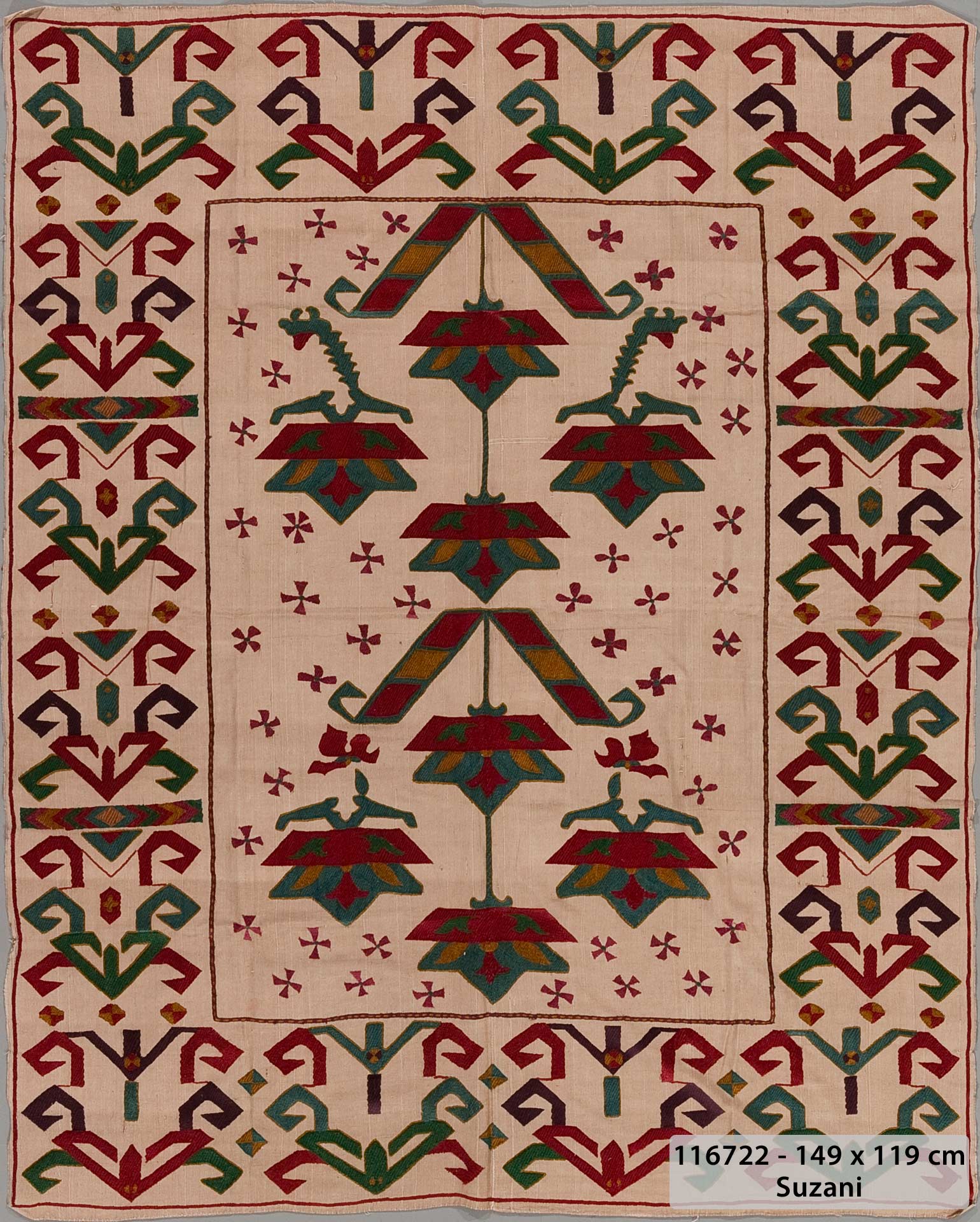 Typischerweise bestehen Suzanis aus einer Baumwoll- oder Seidenbasis, die mit üppigen Seiden- und Wollstickereien verziert ist. Die Motive zeigen häufig Blumen, Tiere, Ranken und Früchte, die aus der jeweiligen Region stammen. Traditionell gehörten Suzanis zur Mitgift einer Braut, um das Zuhause zu schmücken.