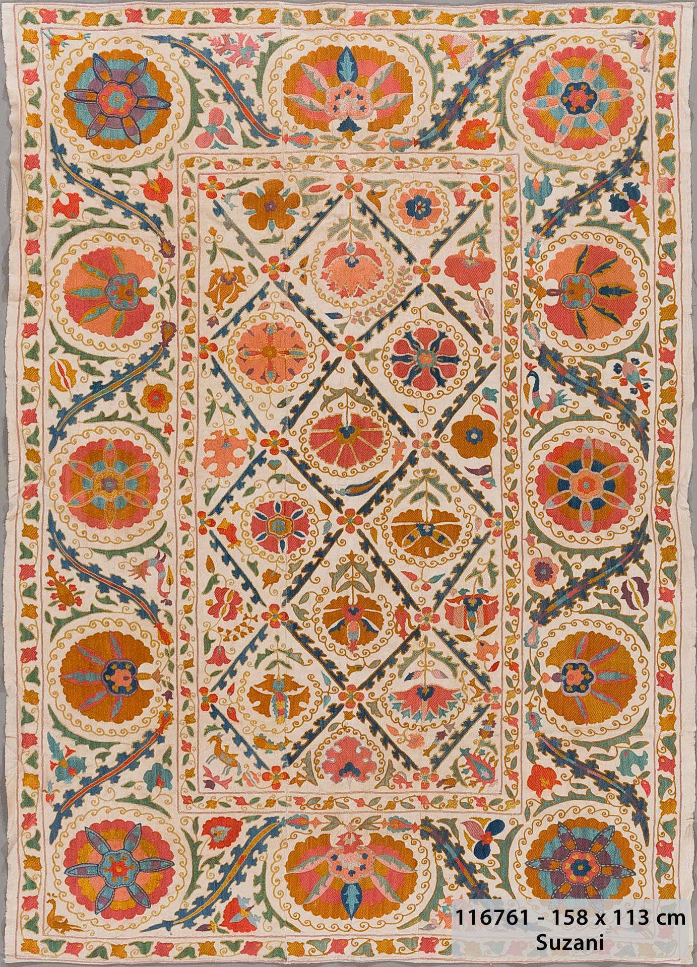 Typischerweise bestehen Suzanis aus einer Baumwoll- oder Seidenbasis, die mit üppigen Seiden- und Wollstickereien verziert ist. Die Motive zeigen häufig Blumen, Tiere, Ranken und Früchte, die aus der jeweiligen Region stammen. Traditionell gehörten Suzanis zur Mitgift einer Braut, um das Zuhause zu schmücken.