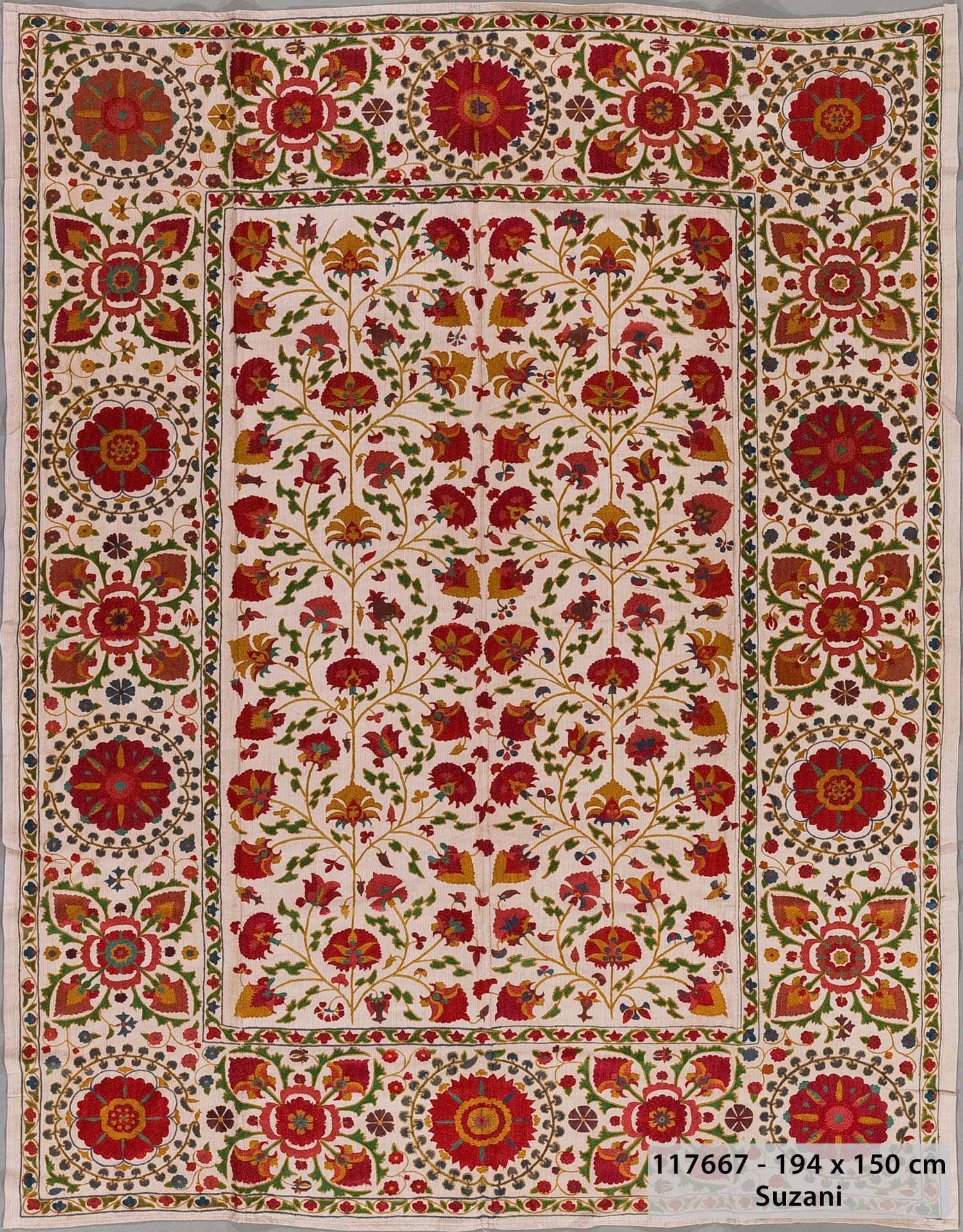 Typischerweise bestehen Suzanis aus einer Baumwoll- oder Seidenbasis, die mit üppigen Seiden- und Wollstickereien verziert ist. Die Motive zeigen häufig Blumen, Tiere, Ranken und Früchte, die aus der jeweiligen Region stammen. Traditionell gehörten Suzanis zur Mitgift einer Braut, um das Zuhause zu schmücken.