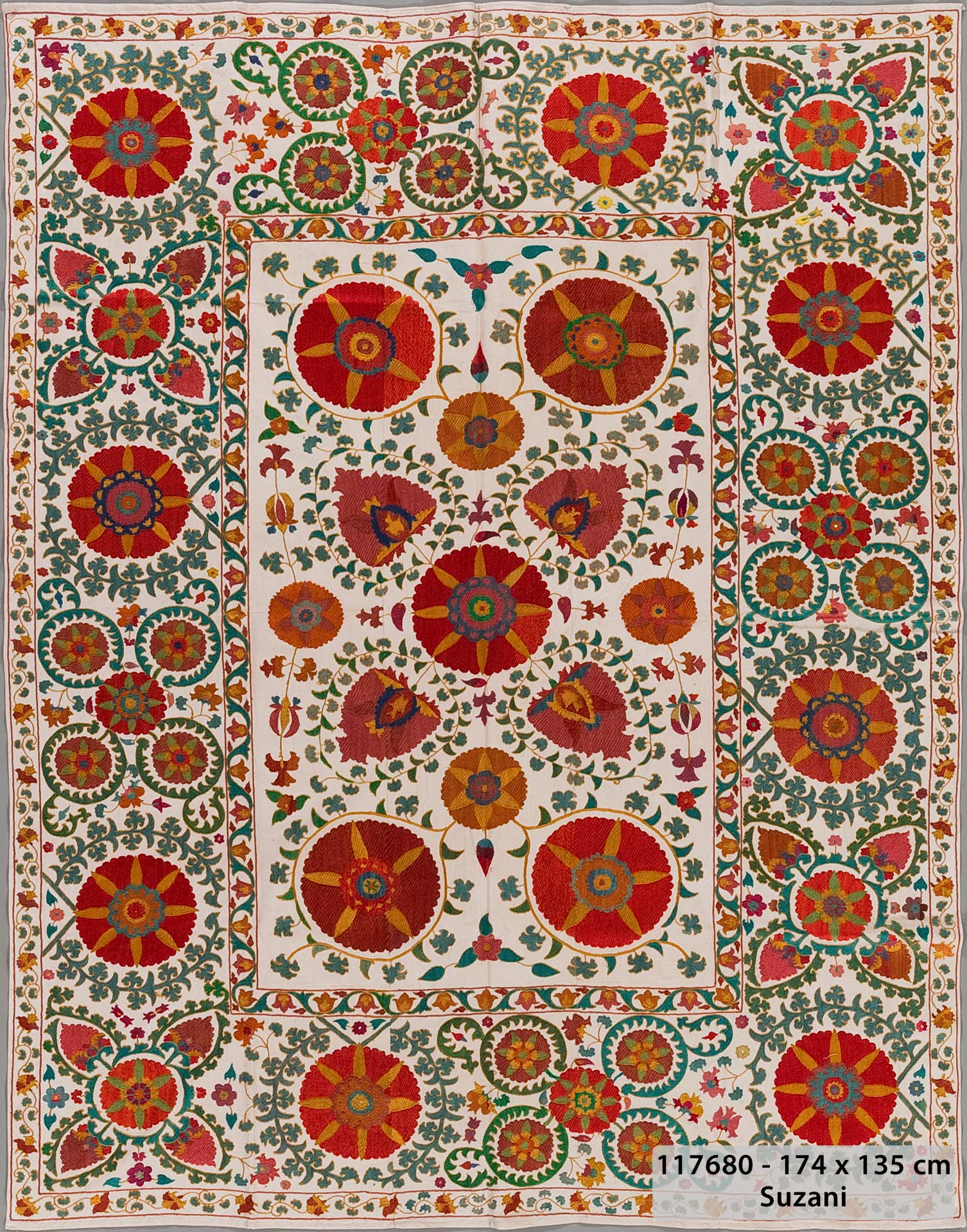 Maße: 174 × 135 cm Herkunft: Zentralasien (Usbekistan, Tadschikistan, Afghanistan) Materialien: Baumwolle oder Seide als Basis, Stickereien aus Seide und Wolle Besonderheiten: Vintage-Einzelstück, handgefertigt
