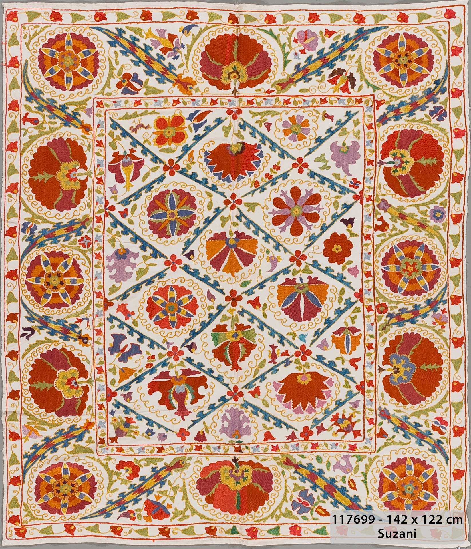 Typischerweise bestehen Suzanis aus einer Baumwoll- oder Seidenbasis, die mit üppigen Seiden- und Wollstickereien verziert ist. Die Motive zeigen häufig Blumen, Tiere, Ranken und Früchte, die aus der jeweiligen Region stammen. Traditionell gehörten Suzanis zur Mitgift einer Braut, um das Zuhause zu schmücken.