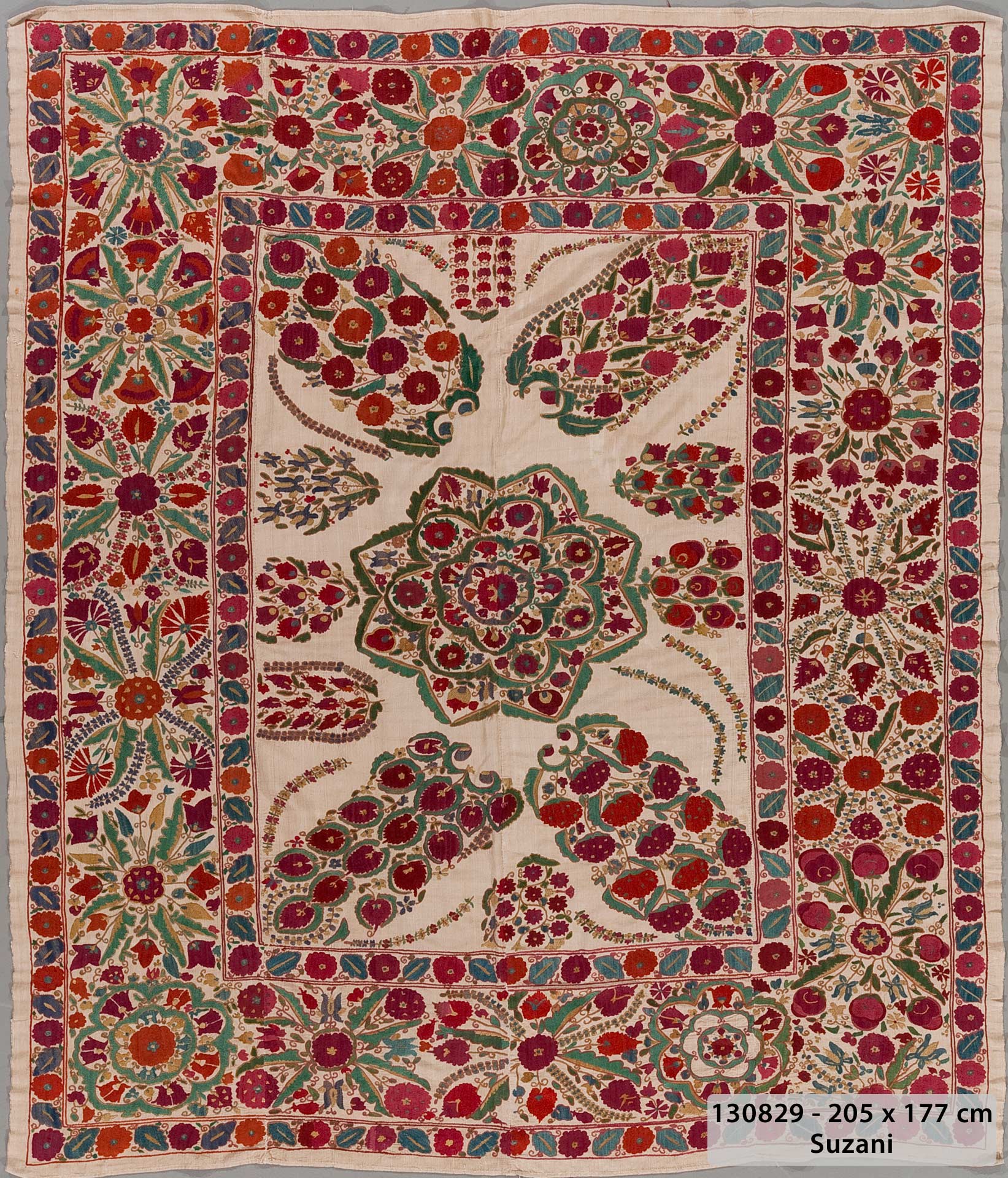 Typischerweise bestehen Suzanis aus einer Baumwoll- oder Seidenbasis, die mit üppigen Seiden- und Wollstickereien verziert ist. Die Motive zeigen häufig Blumen, Tiere, Ranken und Früchte, die aus der jeweiligen Region stammen. Traditionell gehörten Suzanis zur Mitgift einer Braut, um das Zuhause zu schmücken.
