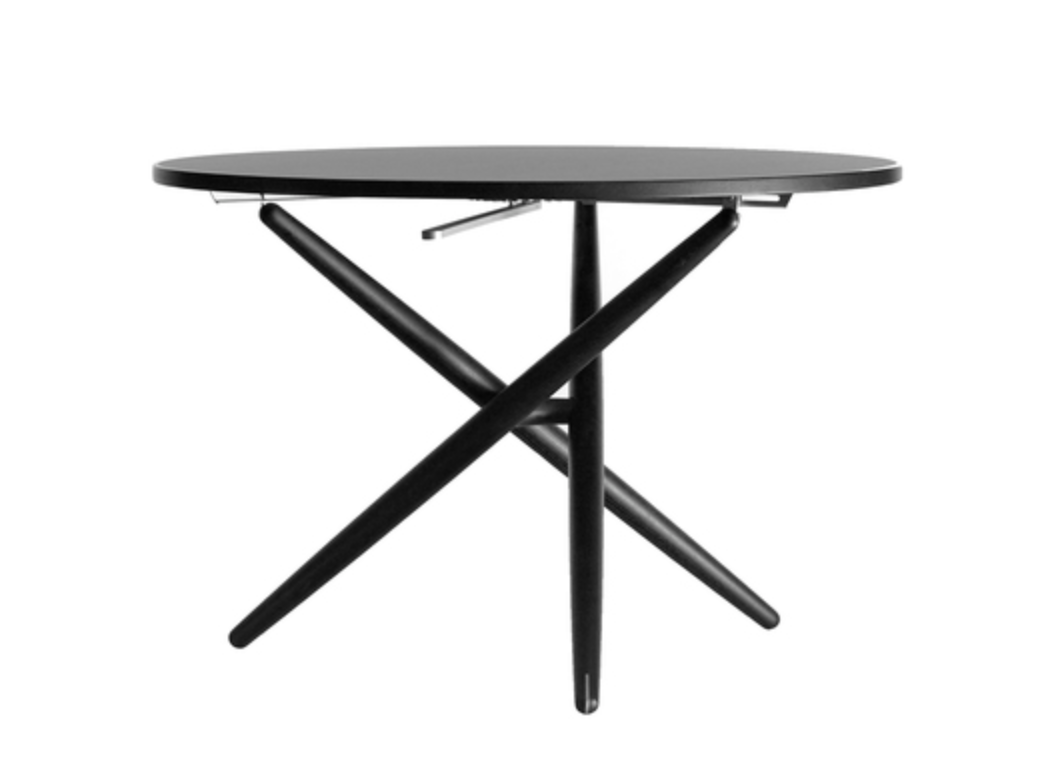 Der ess.tee.tisch ist ein Schweizer Designklassiker, der durch seine geniale Einfachheit beeindruckt. Die Konstruktion basiert auf einem beweglich gelagerten Drei-Bein-Gestell, bei dem die runde Tischplatte auf drei gekreuzten Massivholzbeinen ruht. Diese sind über ein zentrales Gelenk aus Gusseisen verbunden, wodurch sich der Tisch in der Höhe flexibel verstellen lässt – von Couchtisch- bis Esstischhöhe.