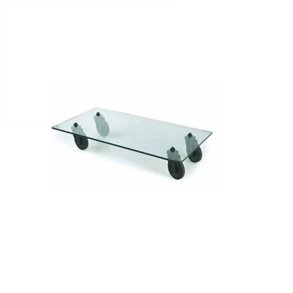 Ein ikonisches Designstück, inspiriert von einem industriellen Transportwagen, wie er in den Werkshallen von FontanaArte zum Einsatz kam. Die Architektin Gae Aulenti ersetzte bei diesem intuitiven Entwurf die ursprüngliche Holzplatte durch eine massive, geschliffene Glasplatte – eine Hommage an die Glasverarbeitung von FontanaArte – und ergänzte ihn mit freilaufenden Industrierollen.