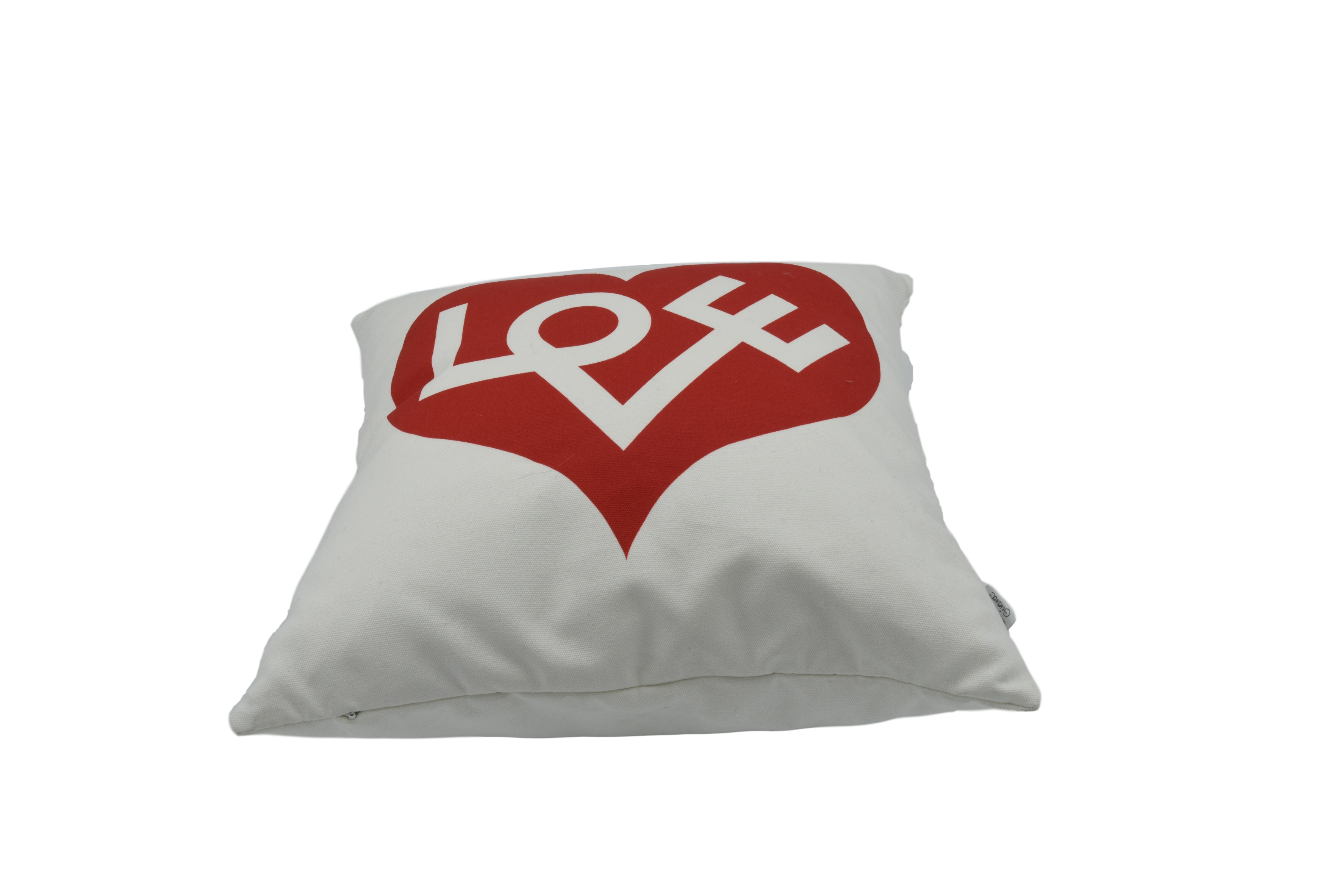 Das Love Kissen besteht aus 100% Baumwolle und erscheint mit einem grossen, roten Herz und dem bekannten Love-Schriftzug in dessen Mitte. Am unteren Rand des Kissens befindet sich ausserdem ein Schriftzug, die Signatur Alexander Girards.